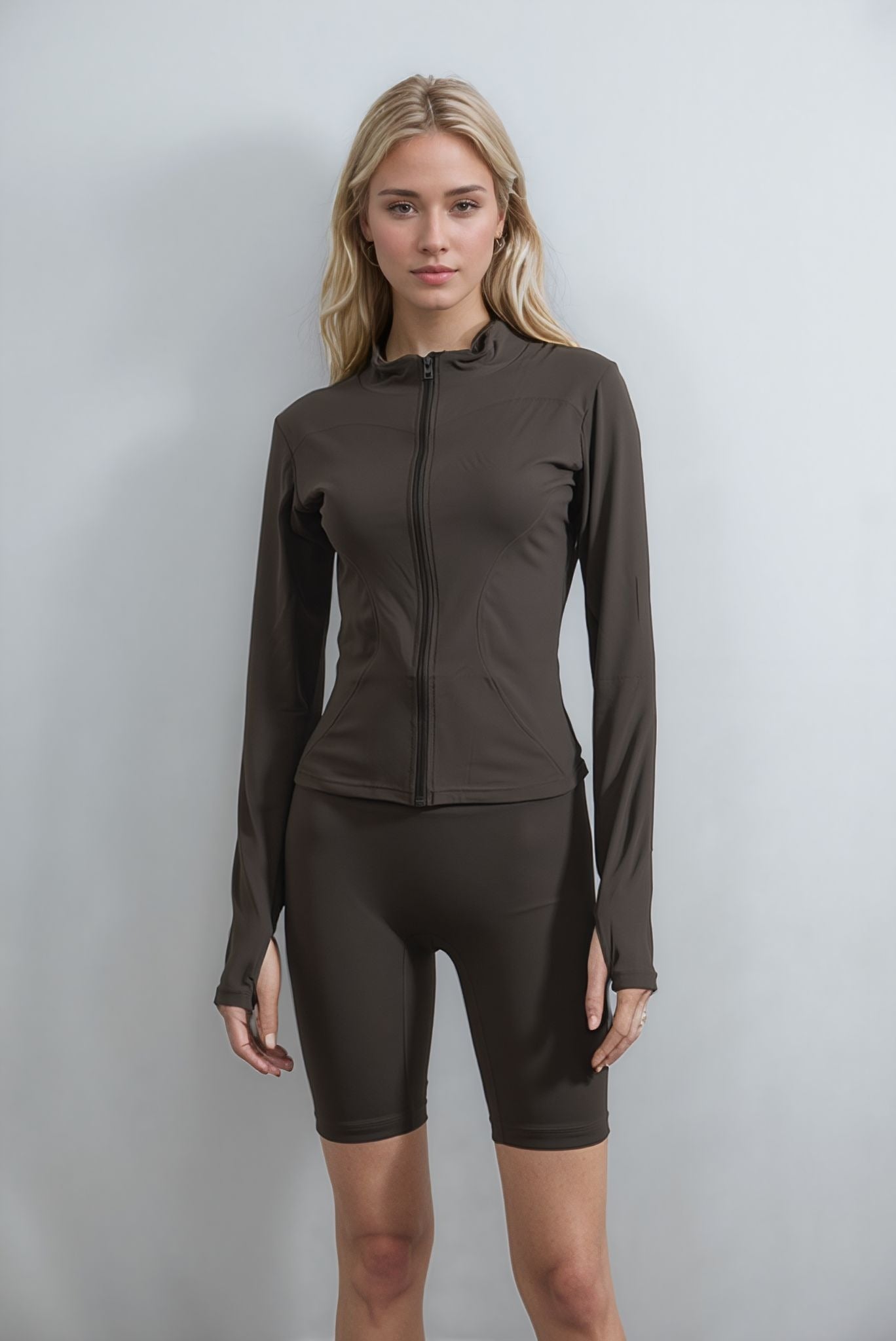 Chocolate Brown Zip Up Jacket & Shorts Contour Sculpt Gym Set