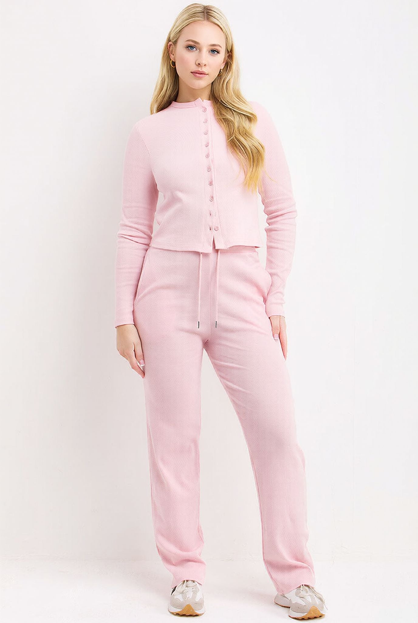 Elevate your relaxation game with this effortlessly chic loungewear co-ord. The soft pink ribbed top features a flattering front button detail that adds subtle sophistication, while the wide-leg trousers offer generous comfort without compromising on style. Perfect for lazy days at home or casual outings, this matching set delivers that coveted put-together look with zero effort. The breathable ribbed fabric moves with you, ensuring all-day comfort whether you're working from home, running errands, or unwinding in style. A versatile wardrobe essential that proves loungewear can be both cosy and chic.