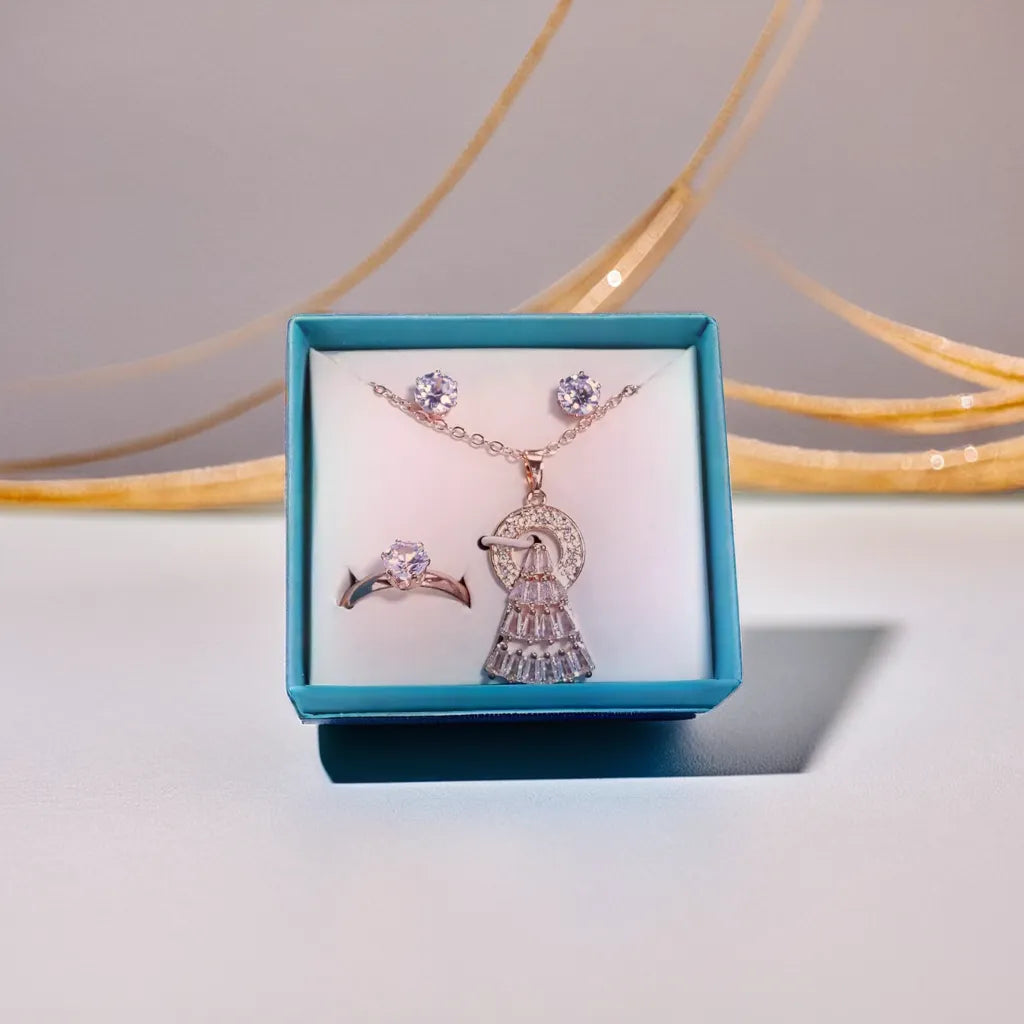 Indulge in luxury with our Rose Gold 3 Piece Jewellery Pendant Set. This set includes a matching ring, earrings, and pendant necklace - perfect for completing any outfit or as a gift for someone special. The unique rose gold design will add a touch of elegance to any look.