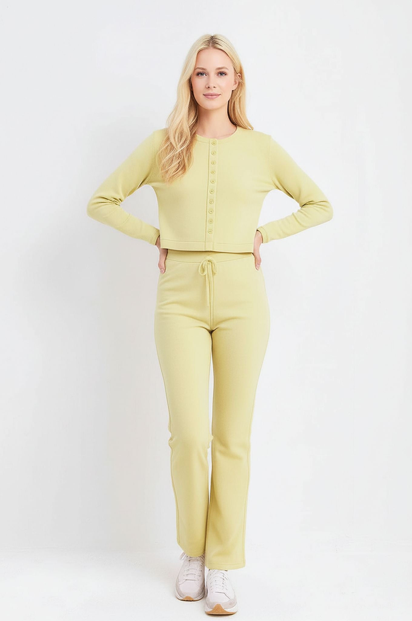 Make loungewear your signature style with this thoughtfully designed co-ord set. The ribbed top features a distinctive front button detail that elevates the everyday aesthetic, while the generous wide-leg trousers deliver a flattering, relaxed fit that moves with you. Rendered in warm beige, this pairing works hard across your wardrobe—dress it down for home comfort or dress it up with jewellery and trainers for an on-trend casual look. The coordinated design means you're always put-together, even when prioritising ease. This is the set you'll reach for again and again, proving that true style never requires compromise.